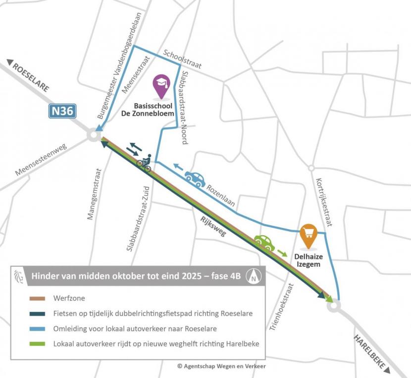 Verkeer richting Roeselare volgt een omleiding via de Kortrijksestraat, Rozenlaan, Slabbaardstraat-Noord, Dahlialaan, Slabbaardstraat-Noord, Schoolstraat en de Burgemeester Vandenbogaerdelaan.